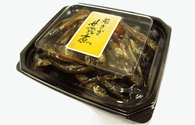 | 原材料名 | ワカサギ(中国産)、砂糖、しょうゆ(大豆・小麦を含む)、水あめ、還元水あめ、寒天/甘味料(ソルビット)、調味料(アミノ酸等)、酸味料、増粘多糖類 |